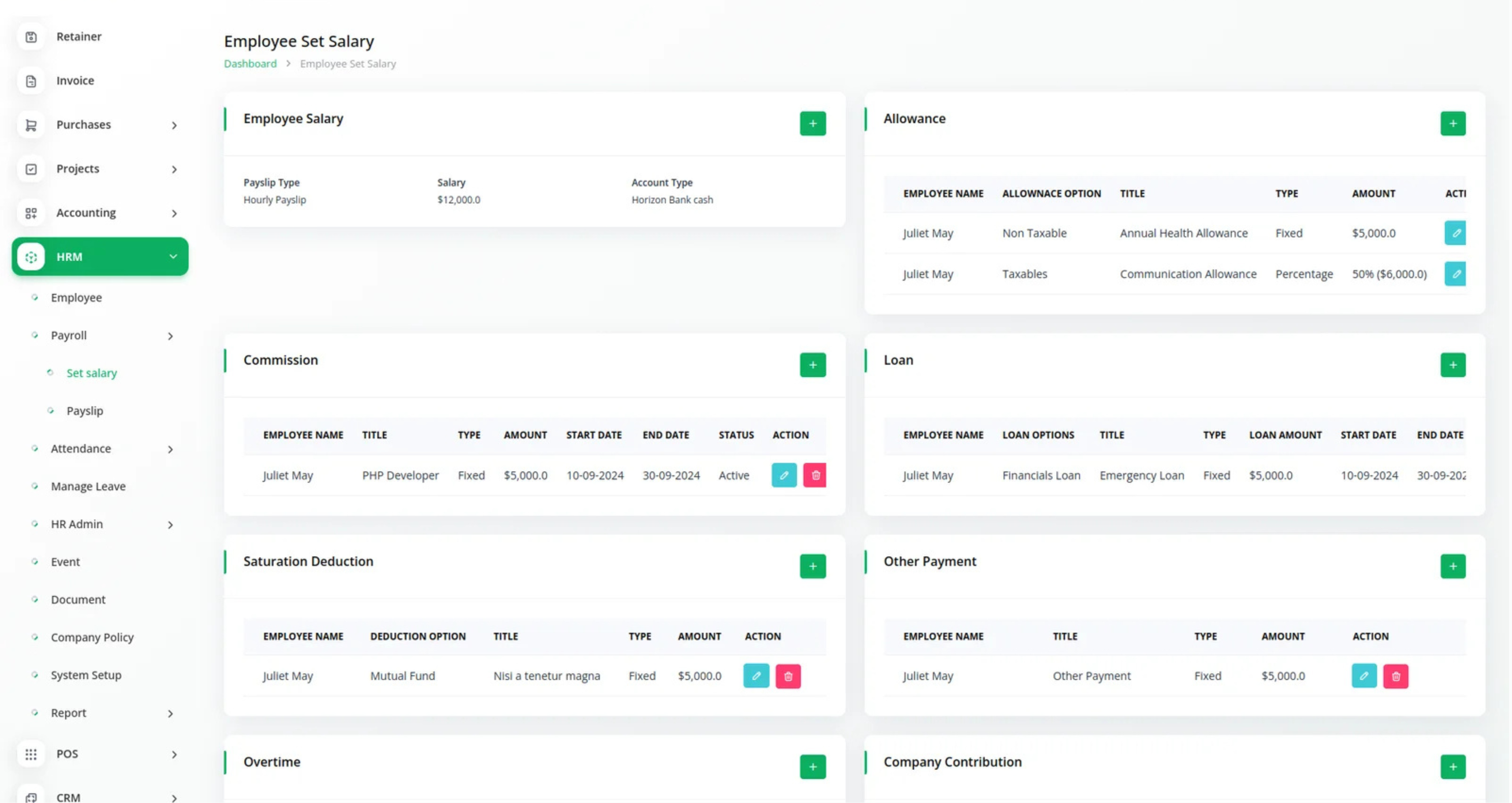 Process payroll in minutes with automatic calculations for salaries, benefits, deductions, and taxes. Maintain records for workforce costs, transactions, and generate payslips with one click.