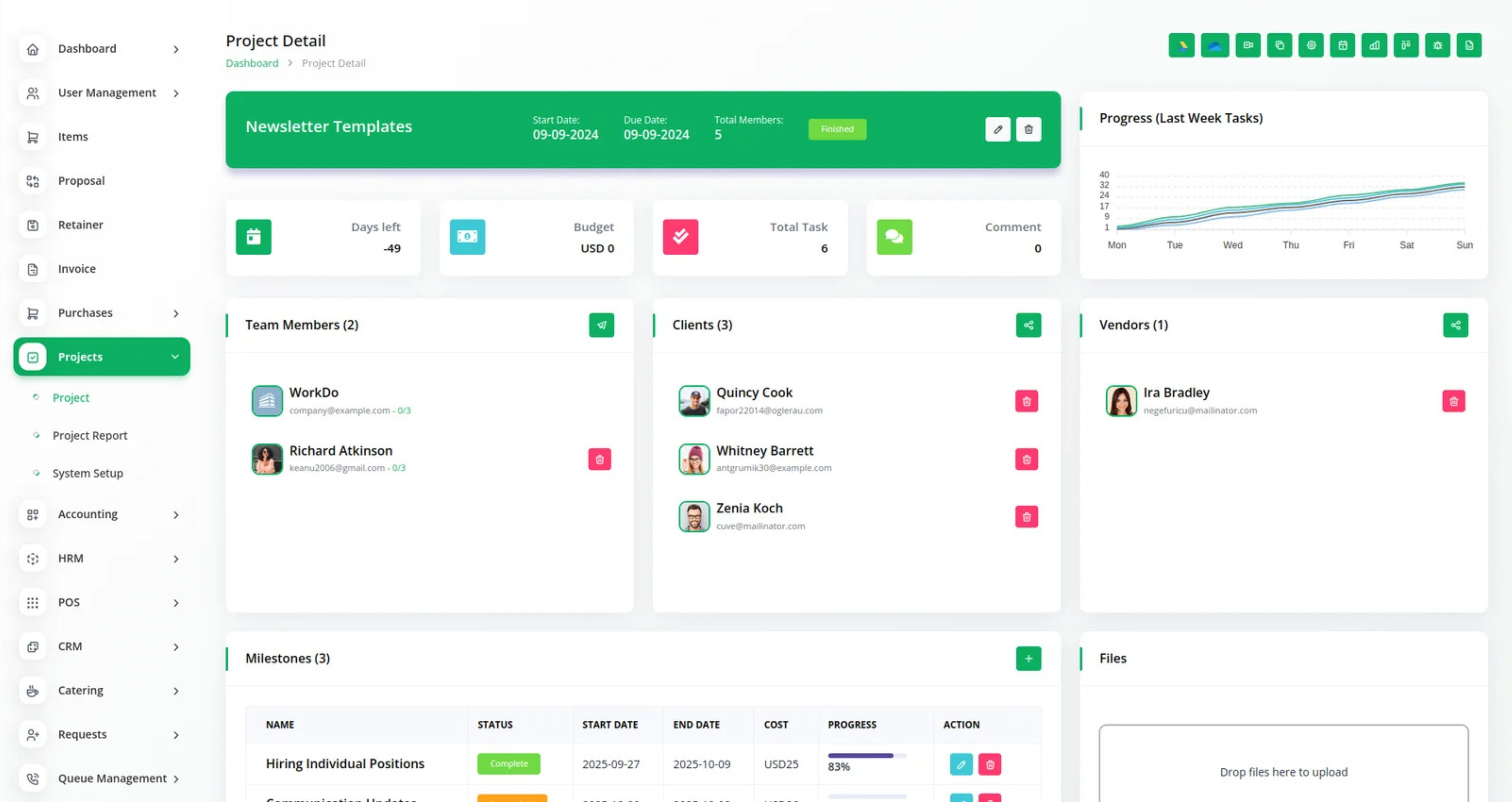 Attach costs, assign milestones, and track status via dropdown menus and Gantt charts. Monitor recent activities and visualize project progress using intuitive graphs and dashboards.