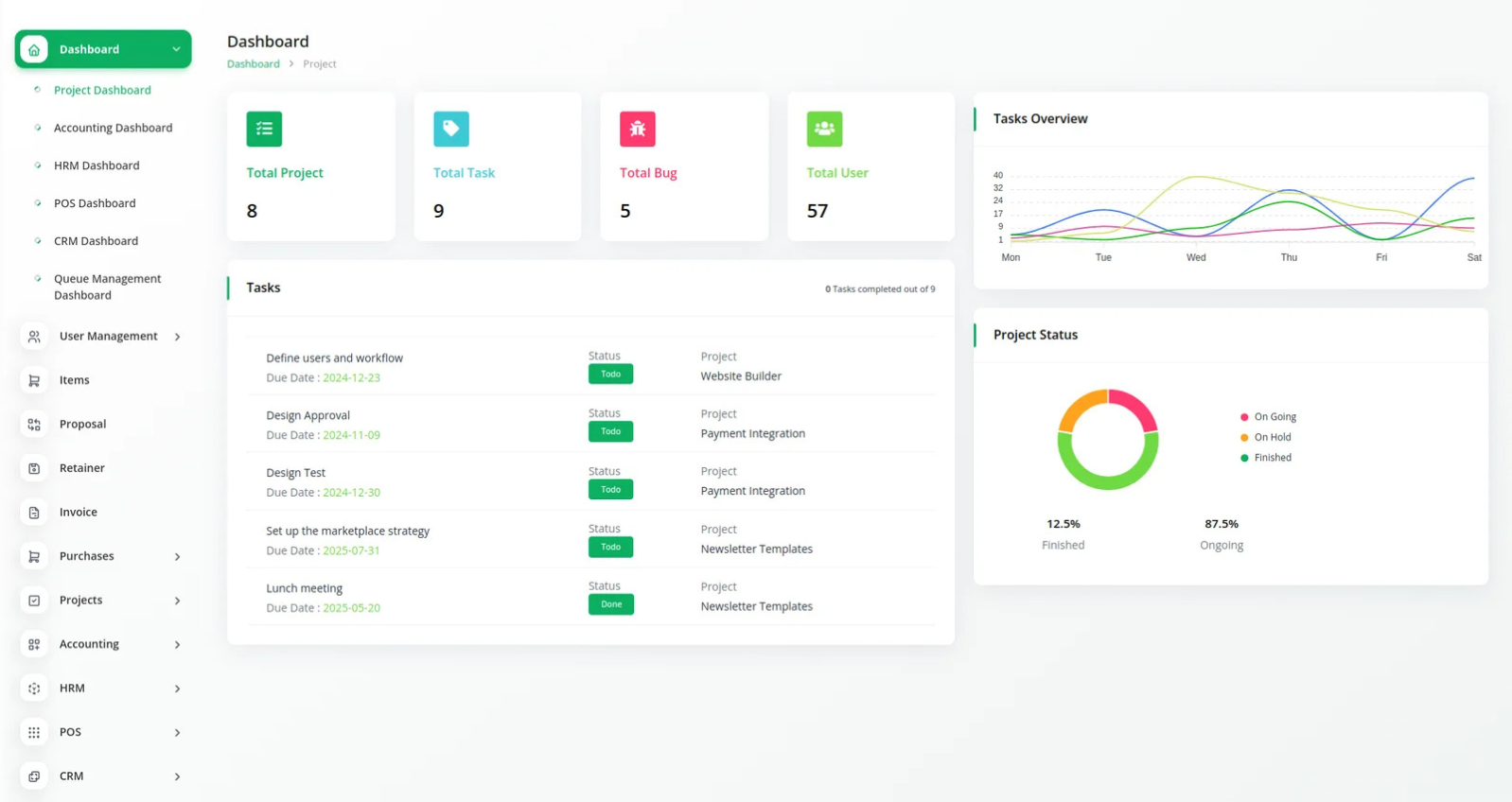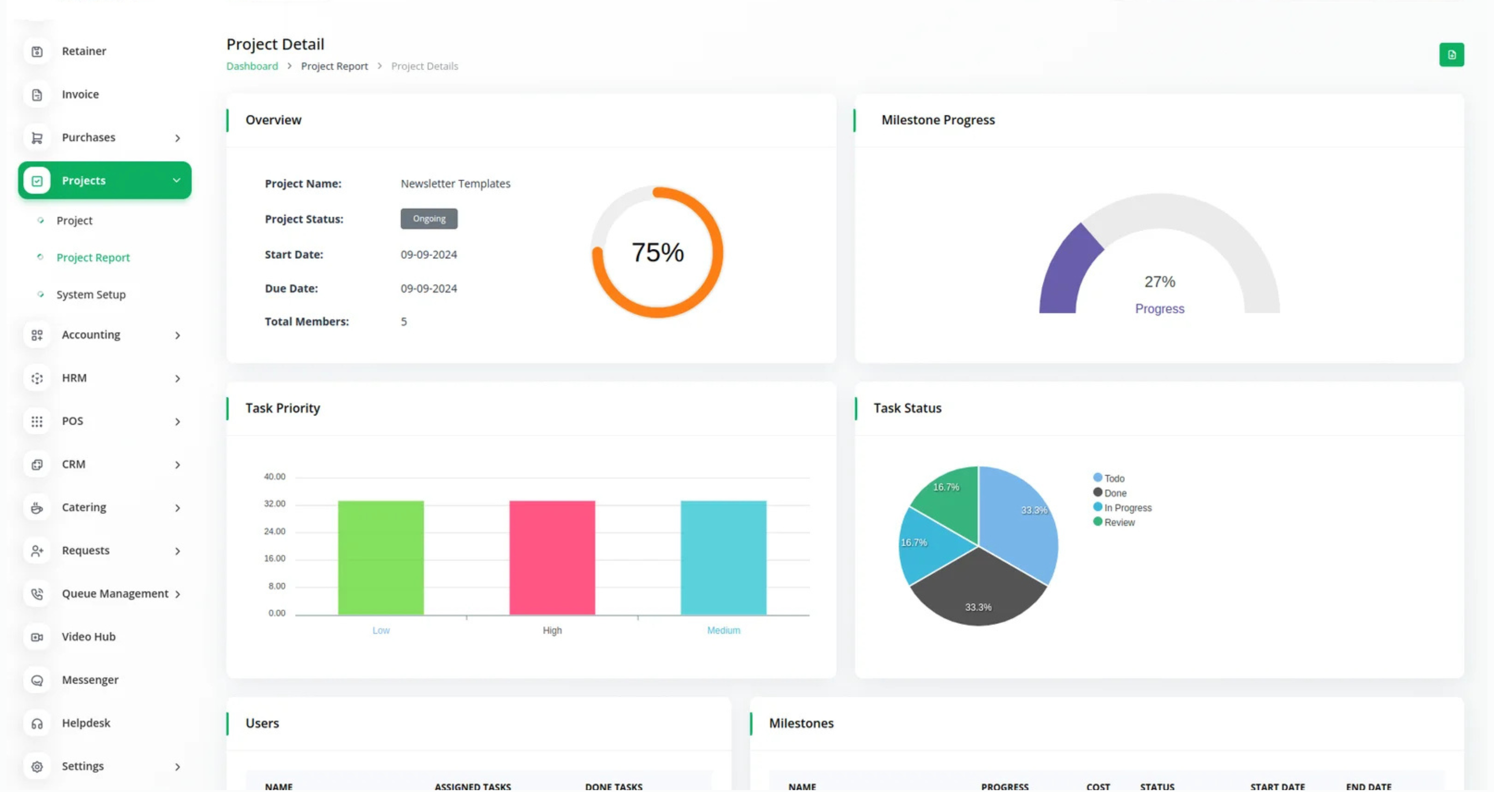 Easily get a complete overview of your projects, tasks, bugs, and team members from a single dashboard. Visual status indicators and task charts provide a clear picture of project progress at a glance. Track pending tasks, top due priorities, and monitor overall timelines to stay in control and prevent delays.